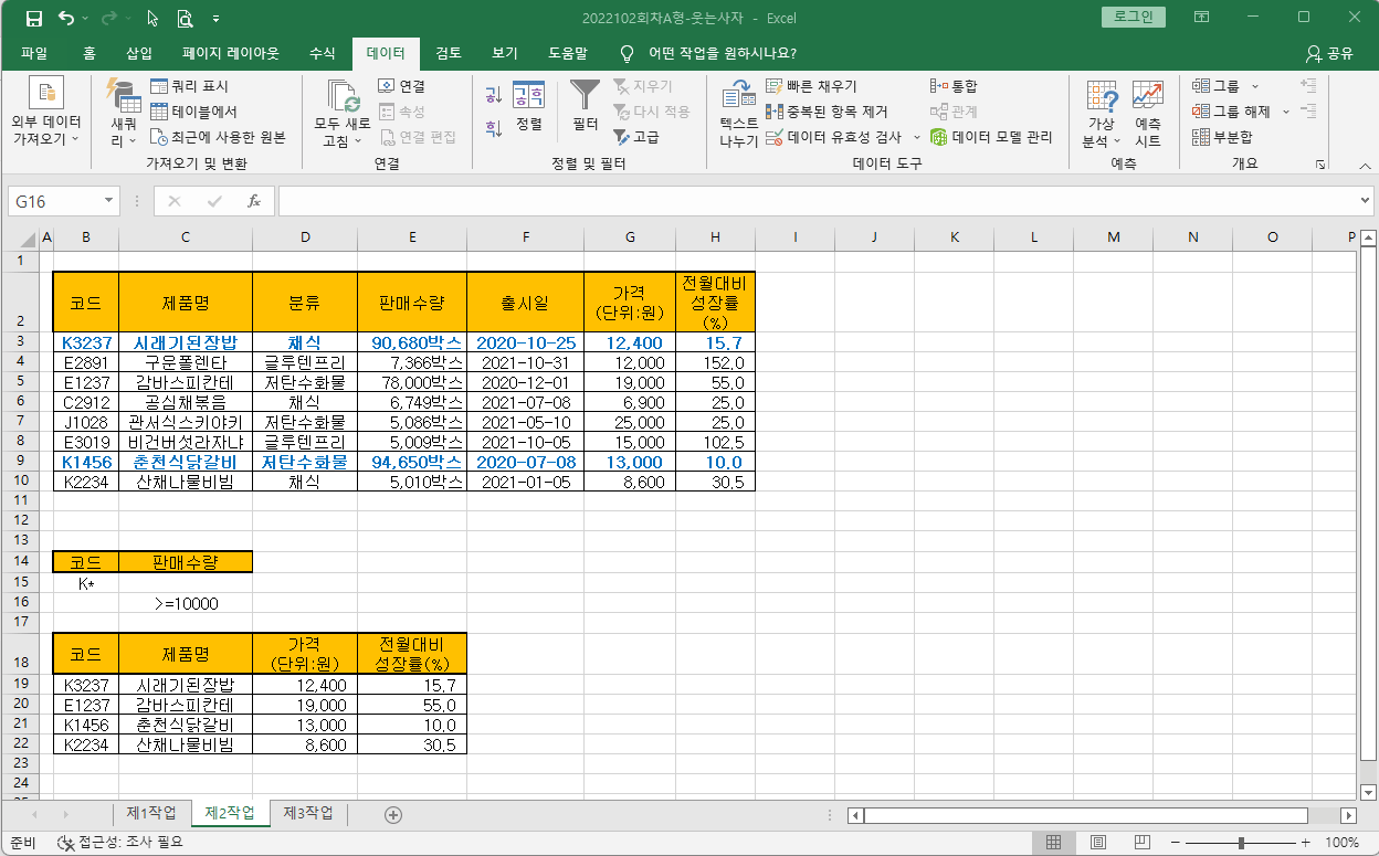 - 코드가 K 로 시작하거나, 판매수량이 10,000 이상인 자료의 코드, 제품명, 가격(단위:원), 전월대비 성장률(%) 데이터만 추출하시오.