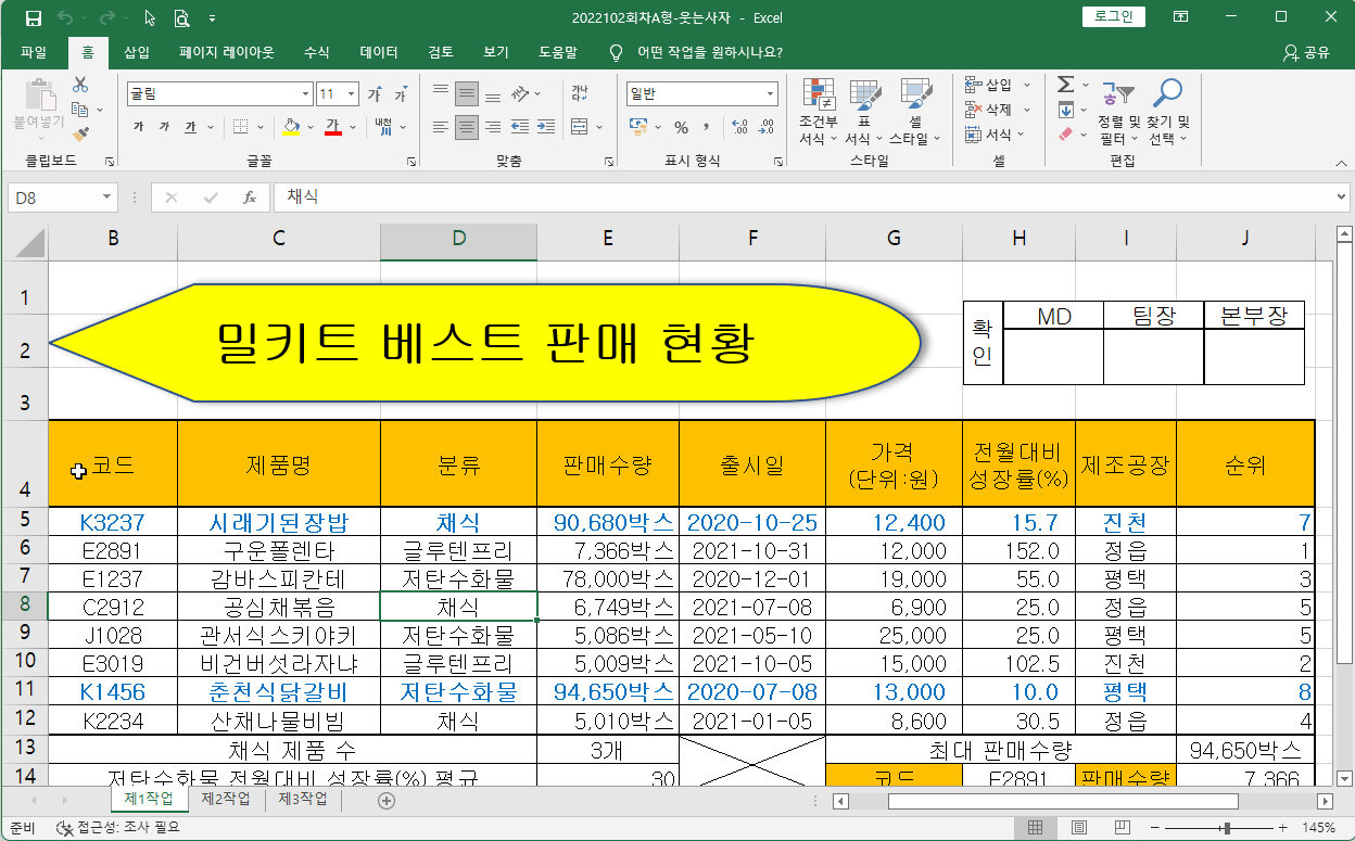 안녕하세요? 웃는 사자입니다. 오늘은 고급필터와 표서식에 관한것을 공부할 차례인데요. 그럼 시작해 보도록 하겠습니다. 제1작업시트의 B4:H12영역을 복사하여 제2작업시트에 B2셀부터 모두 붙