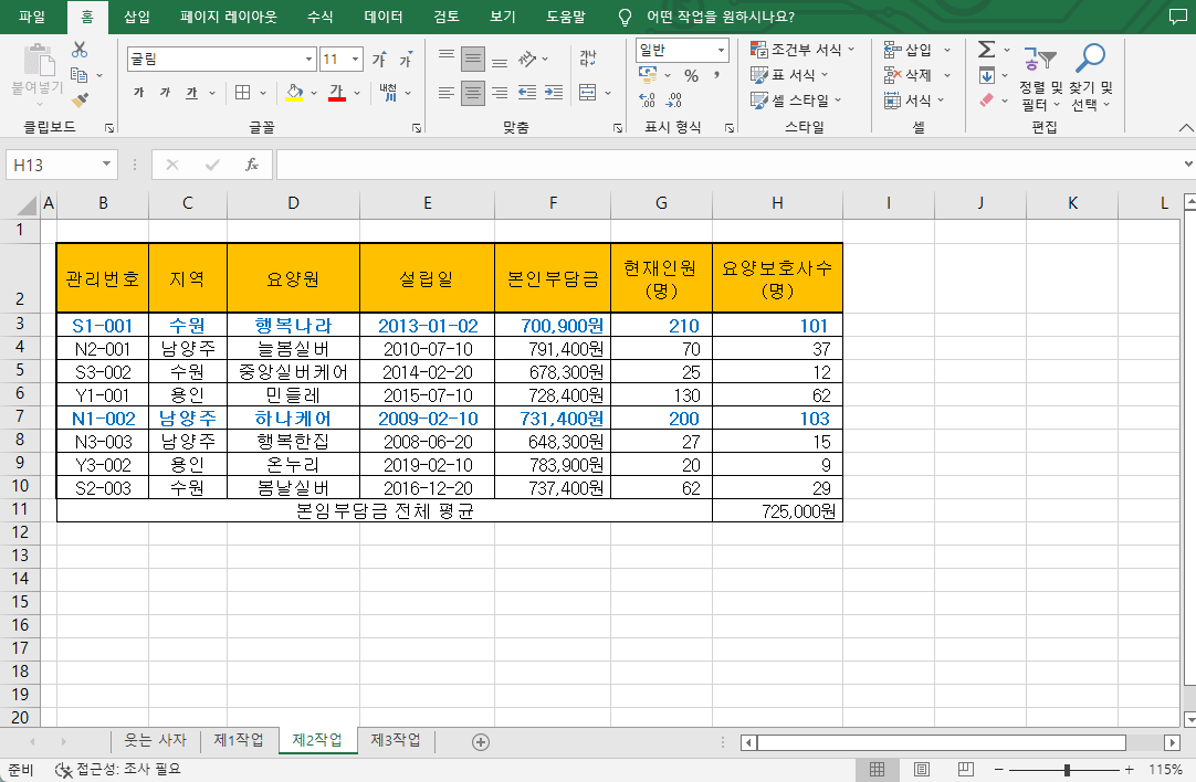 - B11:G11셀을 병합하여 "본인부담금 전체 평균"을 입력한 후 H11셀에 본인부담금의 전체 평균을 구하시오. AVERAGE함 수, 테두리, 가운데맞춤