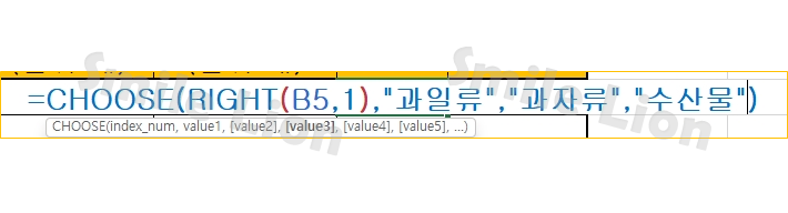 =CHOOSE(상품코드마지막숫자,"과일류","과자류","수산물") 이렇게 되겠네요.